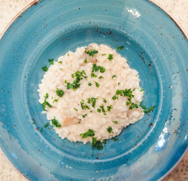 Выложите ризотто на тарелку и украсьте веточками зелени и слайсами обжаренных белых грибов.