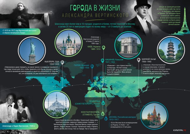 В 2019 году исполнилось 130 лет со дня рождения Александра Вертинского. Шансонье родился в Киеве, жил в Москве, а затем 25 лет провел в эмиграции, останавливаясь на разное время во множестве городов по всему миру. Читайте, где Вертинского арестовала тайная полиция, какая европейская столица восхищала его больше остальных и на какой сцене прошел последний концерт артиста.