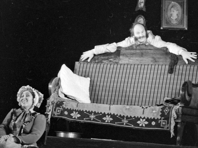 Владимир Хрулев в роли Подколесина и Людмила Колмакова в роли Свахи в спектакле «Женитьба». 1989. Спектакль Камерного музыкального театра, Москва. Русский национальный музей музыки, Москва