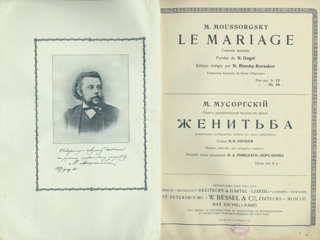 Модест Мусоргский. Опера «Женитьба» в редакции Николая Римского-Корсакова. Действие I. Для пения с фортепиано. Печатное издание. Санкт-Петербург, музыкальное издательство «В. Бессель и Ко», 1911. Русский национальный музей музыки, Москва