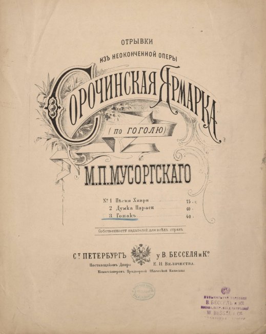 Модест Мусоргский. Гопак веселых парубков из оперы «Сорочинская ярмарка». Первое издание, подготовленное Николаем Римским-Корсаковым. Санкт-Петербург, музыкальное издательство «В. Бессель и Ко», 1886. Русский национальный музей музыки, Москва