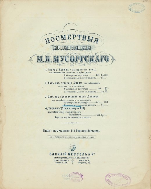 Модест Мусоргский. Хор жриц из оперы «Саламбо» в редакции Николая Римского-Корсакова. Для пения с фортепиано. Первое издание. Санкт-Петербург, музыкальное издательство «В. Бессель и Ко», 1884. Русский национальный музей музыки, Москва