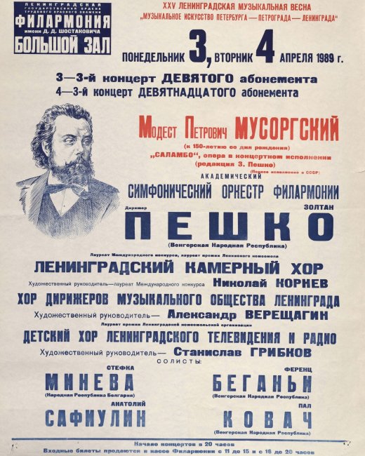 Афиша концертного исполнения оперы «Саламбо». Редакция З. Пешко. 3 и 4 апреля 1989. Большой зал Ленинградской филармонии имени Д. Д. Шостаковича, Ленинград. Русский национальный музей музыки, Москва