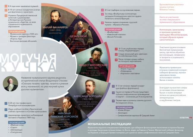 2. Год спустя Балакирев познакомился с военным инженером Цезарем Кюи. В 1857 году — с выпускником военного училища Модестом Мусоргским, в 1862-м — с морским офицером Николаем Римским-Корсаковым, в то же время общие музыкальные взгляды обнаружились с профессором химии Александром Бородиным. Так сложился музыкальный кружок.