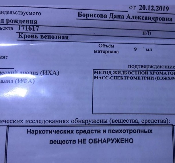 Тогда отец Полины назвал Борисову «наркоманкой», из-за чего Дана была готова прямо там сдать все необходимые анализы, чтобы доказать обратное. Вслед за бывшим мужем обвинения стали поступать и от пользователей в соцсетях, и от СМИ. Возмущенная подобными заявлениями, телеведущая решила сделать необходимые тесты, доказывающие, что в ее организме запрещенных веществ нет. Дана даже предоставила скриншоты результатов, но они не впечатлили пользователей.