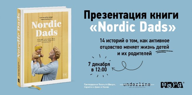 7 декабря 2019 года, в 12:00, в fashion пространстве Underline МЕГИ Теплый Стан, состоится презентация книги «Nordic Dads: 14 историй о том, как активное отцовство меняет жизнь детей и их родителей». В книге описан опыт мужчин из Северных стран и из России, большинство из которых уходили в декретный отпуск, чтобы быть более вовлеченными в жизнь ребенка с рождения. Встреча с авторами и героями книги пройдет при поддержке Посольств Швеции, Норвегии и Дании в России.