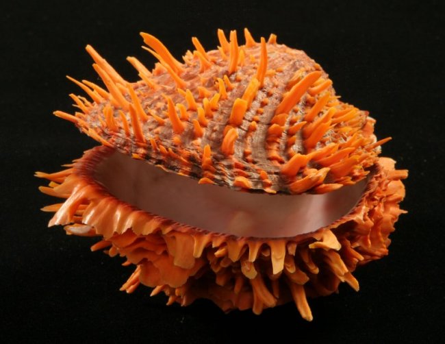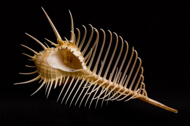 Совершенно удивительны раковины пурпурного мурекса! Ведь на протяжении многих веков они являлись одним из источников пурпура — естественного красителя. Пурпур, полученный из моллюска этого вида, имеет фиолетовый оттенок. На выставке можно увидеть знаменитый конус «Слава Индии». В XVIII–XIX веках был редчайшей раковиной. Сейчас в коллекциях стал менее редким из-за того, что находки моллюсков этого вида участились.