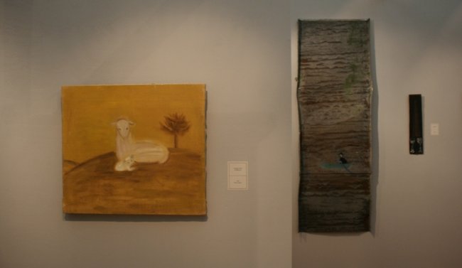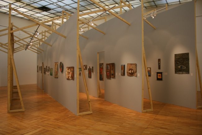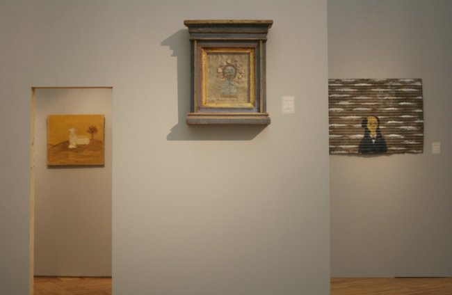 Вокруг портретов сгруппированы объекты, дополняющие ассоциативный ряд: вокруг Андрея Рублева — маленькие фрески, вокруг Петрова-Водкина — кровельное железо, рядом с Алексеем Сотниковым — керамика, а с Тимуром Новиковым — коллаж из ткани.