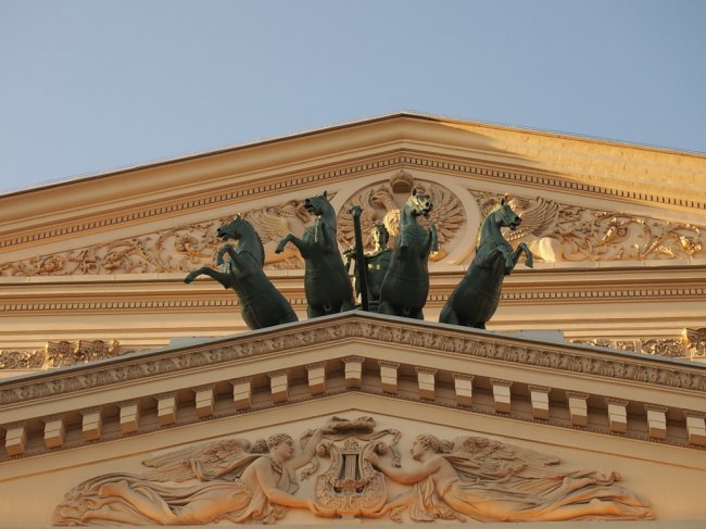 Государственный академический Большой театр РоссииВенчает здание известная на весь мир бронзовая квадрига Аполлона работы Петра Клодта. Мы видим двухколесную колесницу с четырьмя запряженными конями, скачущими по небу и бога Аполлона, управляющего ими. На фронтоне здания был установлен гипсовый двуглавый орел — государственный герб России. На плафоне зрительного зала помещены девять муз с Аполлоном во главе. Благодаря творчеству архитектора Альберта Кавоса, здание прекрасно вписывается в окружающие его строения.