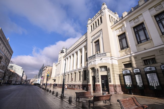 Здание театра, выходящее на красную линию улицы Малая Дмитровка, было построено для Купеческого клуба в 1909 году по проекту архитектора Иллариона Иванова-Шица и его помощника Олтаржевского Вячеслава. По центру между двумя башнями расположена ионическая колоннада большого ордера. Все части фасада украшены лепниной в стиле модерн и ранней неоклассики.