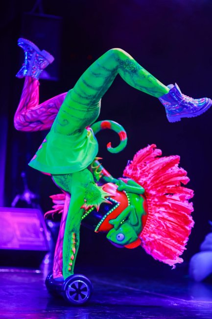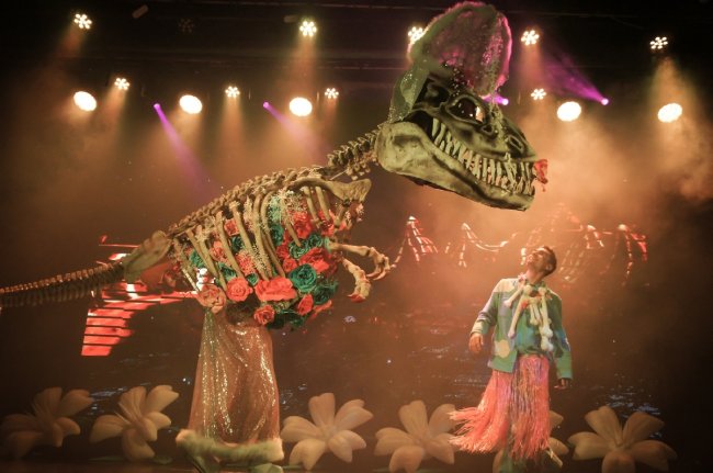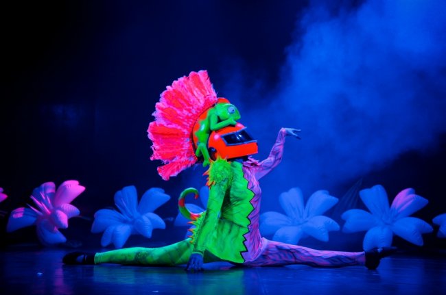 Еще до начала сказки маленькие гости встретятся с веселым луно-зайцем, который смеется, обнимается и готов дурачиться вместе со всеми. На шоу зрители увидят нарядную Бабушку-Динозавра Кармен, которая поет оперу и пританцовывает своими древними косточками, павлина с огромными крыльями, на которых транслируются картинки, хамелеона-петуха, катающегося на гироскутере, и еще много необычных животных, населяющих заповедник мальчика Левы.