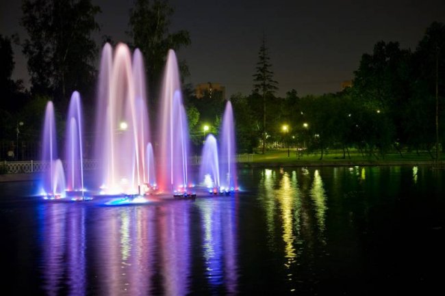 Парк славится своими уникальными фонтанами. В центре одного из прудов — светодинамический «поющий» фонтан. А у другого — из природных камней создан целый каскад-водопад. Очень интересная дизайнерская конструкция у фонтана под названием «Космос», выполненная как летающая тарелка с декоративной подсветкой.