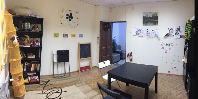 Пространство коворкинга занимает около 25 кв.м., где располагается рабочий стол, посадочные места и книжный шкаф для буккросинга. Также на настенной инсталляции располагается информация об интересных выставках и других мероприятиях в Москве. Еще одно помещение занимает специально оборудованное пространство для проведения курсов для взрослых и детей.