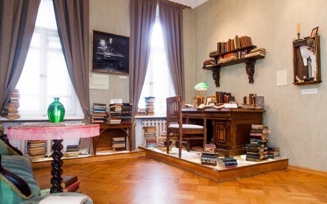 М.А. Булгакова всегда хотел работать в комнате с синими стенами и воплощением его желания стал «Синий кабинет». Здесь были написаны лучшие книги. Обратите внимание на расположенный в углу большой секретер из красного дерева и металла. Над ним он работал, создавая «Мастер и Маргариту«.?Кухня в коммуналке, наполнена предметами обихода той эпохи: кастрюлями, примусами, керосином.?Интересной экспозицией музея является выставка редакции газеты «Гудок». В ней в двадцатые годы работали такие писатели, как М. Булгаков, В. Маяковский, И. Ильф и Е. Петров, В. Катаев. Выставка включает архив, редакционные документы, выпущенные газеты и журналы.