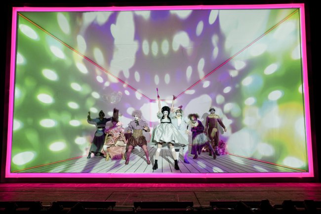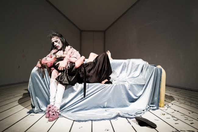 И вот они нарядные сами появляются перед зрителями. По залу мгновенно разлетается шепот, не Андрей Бартенев ли создавал костюмы. Нет, сценографией и костюмами занималась художница Галя Солодовникова (работала с Серебренниковым, Диденко, Варнавой). Ее персонажи напоминают напомаженных французских кукол из старого бабушкиного сундука. Платьица сохранились идеально, а вот на личиках отразилась печать времени: то белила потекли, то веки почернели. Эдакий мексиканский День мертвых с парижским шиком.