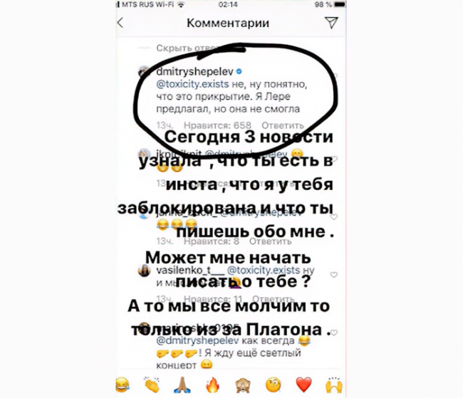 В Сети произошел очередной звездный конфликт. Комментируя свои отношения с дизайнером Екатериной Тулуповой, телеведущий Дмитрий Шепелев неудачно пошутил в ответ на предположение одной из своих подписчиц о его якобы нетрадиционной ориентации. «Не, ну понятно, что это прикрытие, я Лере предлагал, но она не смогла» (здесь и далее орфография и пунктуация авторов сохранены, — прим. ), — заявил Дмитрий. На эту шутку моментально отреагировала Лера Кудрявцева. «Сегодня три новости. Узнала, что у тебя есть Instagram, что я у тебя заблокирована, и что ты пишешь обо мне. Может, мне начать писать о тебе? А то мы все молчим-то только из-за Платона», — такой пост опубликовала телеведущая.