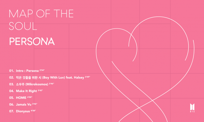 Новый альбом BTS «Map Of The Soul: Persona» выйдет уже 12 апреля, и наконец-то BigHit выложили в сеть плейлист к новой пластинке. Он оказался не очень длинным, но очень вкусным! В новый альбом группы войдет 7 треков, включая коллаборацию с Холзи (Halsey) «Boy With Luv».