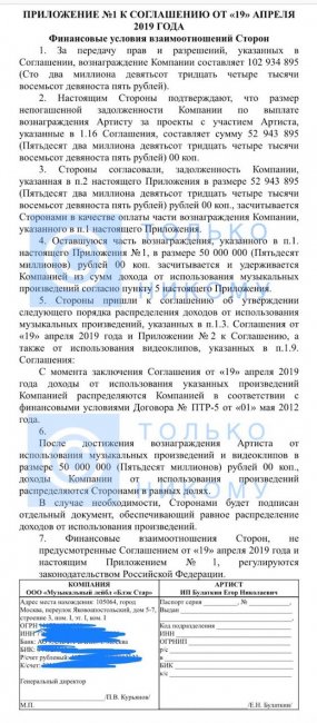 В опубликованных файлах значится, что все песни Крида принадлежат Black Star, но лицензию на их исполнение Егор все же получил. В одном из черновиков договора сообщается, что «освобождение» музыканту обошлось в 102 миллиона рублей. Но выплачивать эту сумму ему не пришлось.