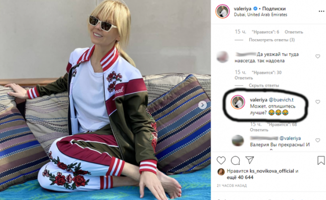 Валерия и ее муж, продюсер Иосиф Пригожин, сейчас отдыхают в Дубае. В последнем посте певица пожаловалась на то, что им не повезло с погодой: «Три дня лил дождь такой силы, что затопило половину города. Следующие три будет солнечно, но прохладно» (орфография и пунктуация автора сохранены, — прим. ). В ответ на это Валерия получила неожиданный совет от одной из подписчиц. «Да уезжай ты туда навсегда, так надоела», — написала женщина. Впрочем, грубостью на грубость артистка отвечать не стала, вместо этого посоветовала всем недовольным просто от нее отписаться, снабдив свое сообщение смеющимися смайлами.
