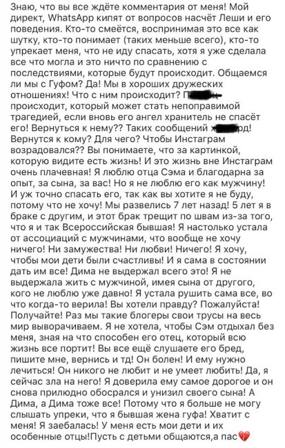 Бывшая жена Долматова очень болезненно отреагировала на выходку рэпера. Айза Анохина опубликовала большой пост в Instagram и рассказала, что поклонники музыканта пишут ей просьбы вернуться к бывшему мужу и спасти его. Анохина отметила, что не хотела отпускать к Гуфу сына. А в конце Анохина заявила, что и ее нынешний брак с бизнесменом Дмитрием Анохиным, от которого она родила сына Элвиса, трещит по швам из-за поведения Долматова.