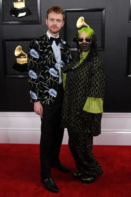 Билли Айлиш с братом Финнеасом не стали изменять собственному стилю. Певица вышла на ковровую дорожку в мешковатом брючном костюме Gucci черно-коричневого цвета с яркими салатовыми вставками. На лице у нее была прозрачная защитная маска. А Финнеас появился в черном пиджаке с принтом из крупных голубых цветов, в рубашке в тон принту, большой черной бабочке и в классических брюках.