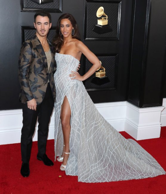 Кевин Джонас подобрал для ковровой дорожки костюм из коричневого пиджака с принтом в виде птиц, а его супруга Дэниель облачилась в серо-жемчужное платье с длинным шлейфом, открытыми плечами и высоким разрезом до середины бедра.