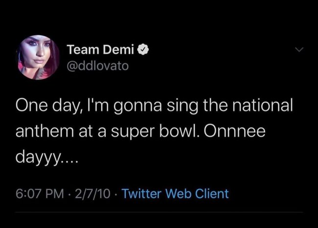 В 2010 году об этом мечтала тогда еще юная звезда телеканала Disney, 17-летняя Деми Ловато. О своих планах выступить на Суперкубке Ловато рассказывала в Twitter. Спустя 10 ет ее мечты сбылись!