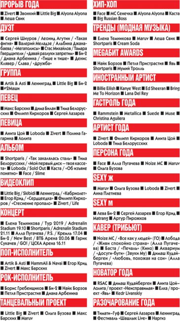 Более 150 тысяч читателей приняли участие в первом этапе «слепого» голосования, когда можно было предлагать любую кандидатуру любимого исполнителя или группы в 23 номинациях. В итоге в финальные пятерки вошли 64 артиста, исполнителя и группы — не только известных и популярных, но также и тех, кто в ушедшем году ярко дебютировал на сцене, привнес свежих красок и новых акцентов в музыкальную жизнь. Этим новичкам посвящен небольшой обзор «Фреш, пожалуйста» в сегодняшней «ЗД», как и представление звездных номинантов.