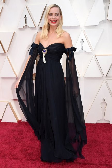 Марго Робби также доверила свой образ стилистам Chanel, надев черное платье с глубоким декольте и длинным шлейфом в качестве рукавов.