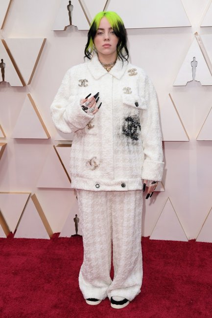 Главное открытие минувшего года, 18-летняя певица Билли Айлиш, выбрала непривычный для себя наряд. Обладательница пяти Грэмми позировала в белом брючном костюме Chanel. Образ она дополнила эффектным маникюром и массивными украшениями.
