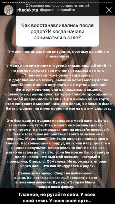 После родов Рита решилась на липосакцию, потому что не могла сбросить вес из-за гормонального сбоя. Сейчас она жалеет об операции. Вдобавок к проблемам со здоровьем ей было сложно видеть экс-супруга рядом с красивой фитнес-инструктором, с которой Соколовский начал встречаться всего через месяц после развода.