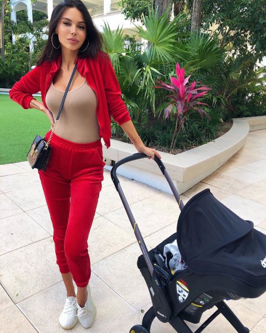 Также жена Джигана опубликовала фото в облегающем бежевом топе и красном спортивном костюме.