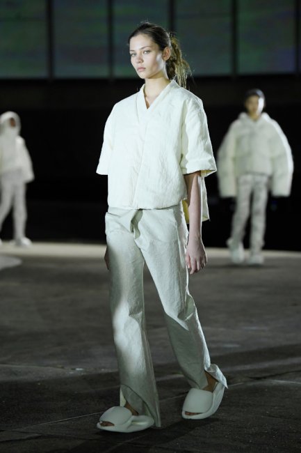 42-летний рэпер Канье Уэст представил новую коллекцию своего бренда Yeezy Season 8 в рамках Недели моды в Париже. Акцентными цветами нарядов стали кремовые и сине-голубые голубые оттенки. Модели представили кроп-топы, пуховики, брюки и удобную обувь.