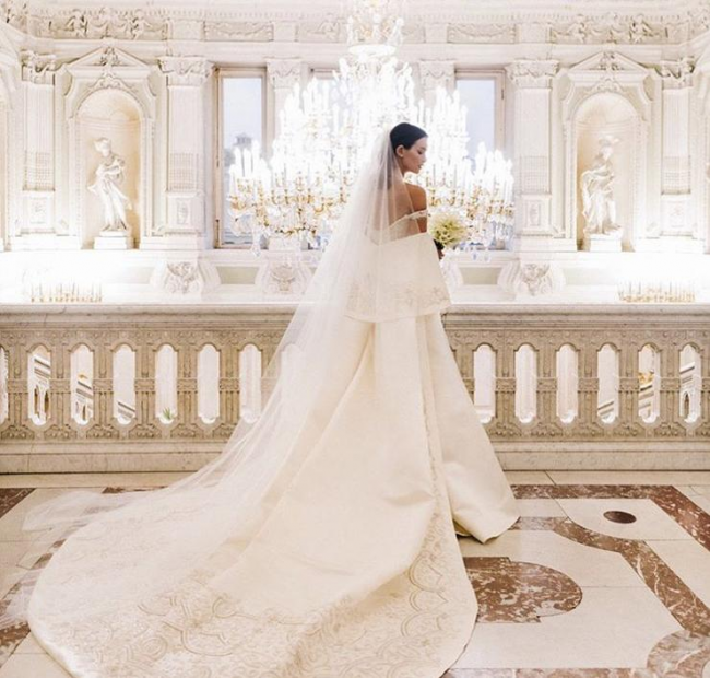 Ксения предстала в двух образах, выбрав сдержанное платье прямого кроя для венчания и пышное кружевное платье со шлейфом для свадьбы, которую отметили в популярном кафе.