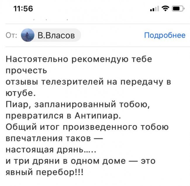 Но гнусности в отношении Наталии продолжились и после выхода программы. В результате монтажа из отца Власовой сделали героя, а на нее в youtube посыпалась невероятная волна негатива, чего она также не стала скрывать. Увидев, что пишут девушке хейтеры, отец певицы прислал ей сообщение, где оскорбил даже свою 13-летнюю внучку.