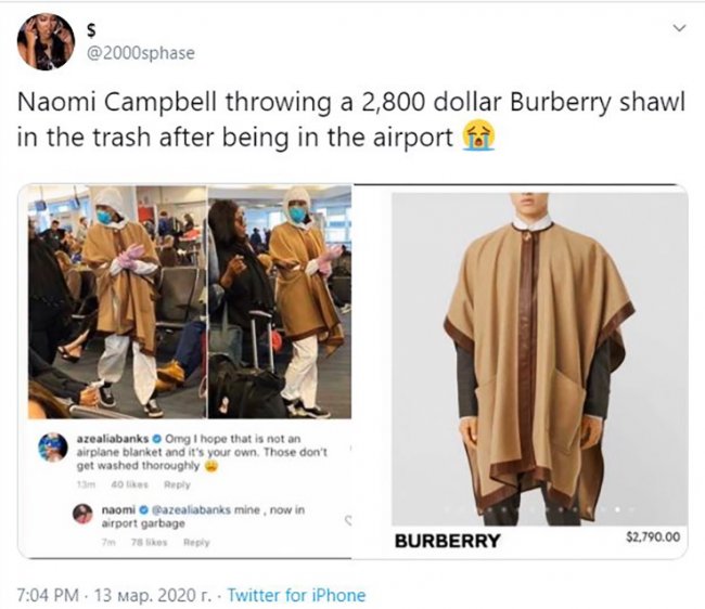 Когда рэперша Азилия Бэнкс выразила опасения, что на плечах Наоми грязный плед из самолета, Наоми ответила: «Это моя накидка. И она уже в мусорке». Фэшн-эксперты быстро выяснили, что это было пончо Burberry стоимостью около $3000.