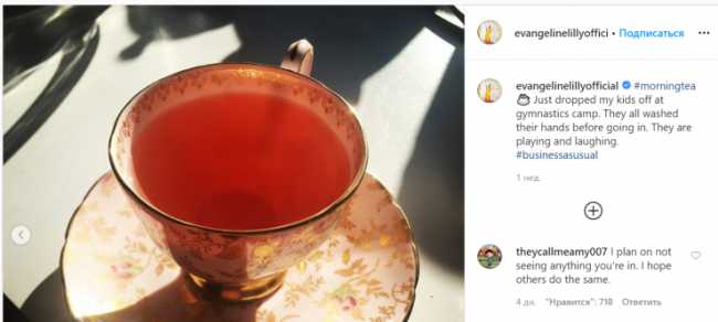 А вот еще одна экранная супергероиня Эванджелин Лилли (Оса из «Человека-муравья») может лишиться работы из-за неосмотрительных комментариев. 16 марта она написала в Instagram, что пьет чай после того, как отвезла детей в гимнастический лагерь. И добавила, что все они хорошо помыли руки, сопроводив пост хештегом #жизньидетсвоимчередом (business as usual). Актрису обвинили в том, что она не соблюдает режим самоизоляции и не думает о тех, кому может передать вирус. Даже актриса Софи Тернер назвала такое поведение «глупым».
