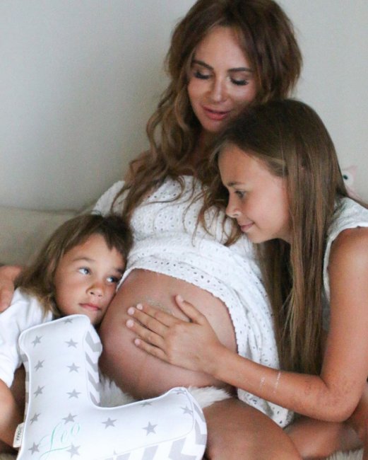 На снимках Саша позирует с округлившимся животом в компании старшей дочери, держит на руках новорожденного ребенка и умиляется, когда дети целуют ее.