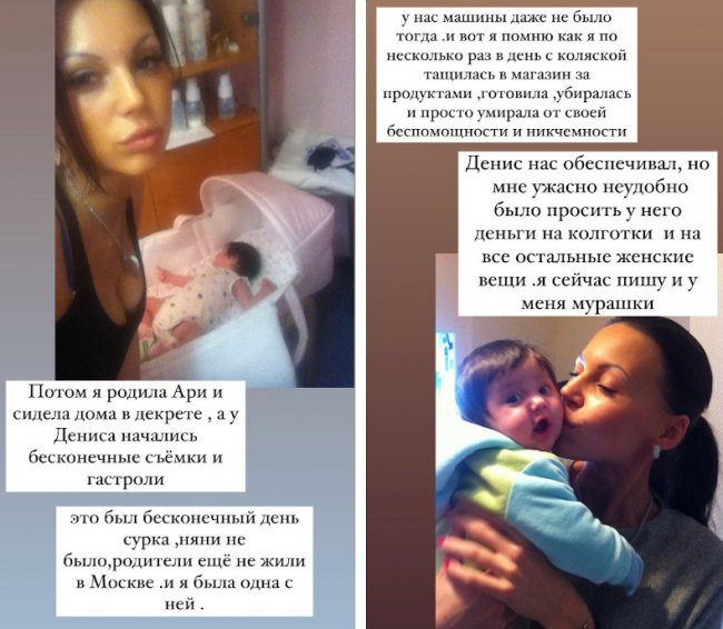 «Мы были обычной парочкой в начале своего пути. Денис начал развиваться в музыке, а я забеременела. Потом родила Ари и сидела дома в декрете, а у Дениса начались бесконечные съемки и гастроли. Это был бесконечный день сурка, няни не было, родители еще не жили в Москве, и я была с малышкой одна»