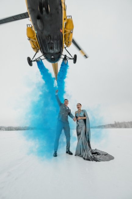 Однако из-за плохих погодных условий им пришлось поменять планы, и вверх взлетел большой вертолет. Он раскрасил небо ярко-голубым дымом, который означал, что пара ждет сына.