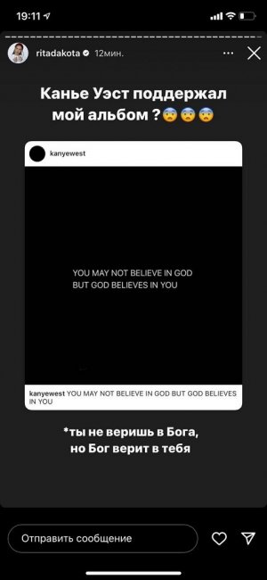 «YOU MAY NOT BELIEVE IN GOD BUT GOD BELIEVES IN YOU»/ «Ты не веришь в Бога, но Бог верит в Тебя» - слова, которые выложил американский рэпер Канье Уэст на своей странице сегодня всего за несколько часов до релиза трека Риты Дакоты, слово в слово процитировали припев ее песни «Ты не веришь в Бога».