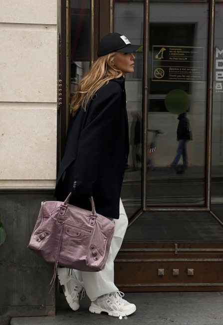 Бывшая солистка «ВИА Гры» вернулась в Москву: на фото она позирует у входа в столичный ресторан. Певица позирует перед камерой в мешковатых белых брюках, оверсайз-пиджаке и черной бейсболке, в руках у нее объемная розовая сумка.