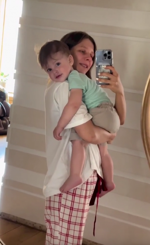 Елизавета опубликовала кадры, на которых позирует перед зеркалом с двухлетним сыном на руках. Лев обнимает актрису и посылает в камеру воздушные поцелуи по просьбе мамы.