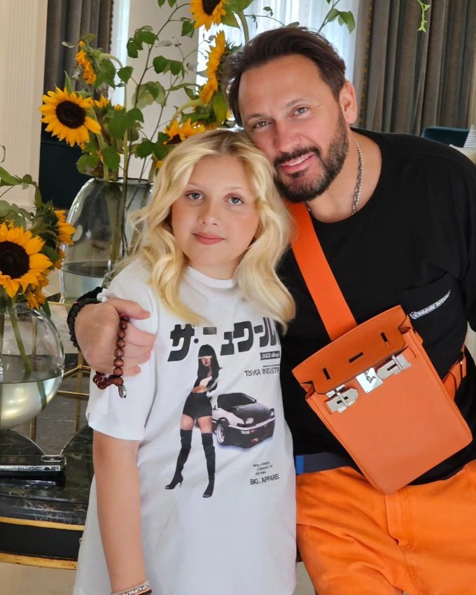 На свежем снимке певец позирует вместе с юной наследницей. Младшая дочь предстала перед поклонниками в белой футболке с ярким рисунком. Образ блондинки дополнила укладка в виде голливудских волн. Звездный отец выбрал для совместного снимка черную футболку, яркие брюки и сумку оранжевого цвета. «Любовь навсегда», – лаконично подписал кадры певец.